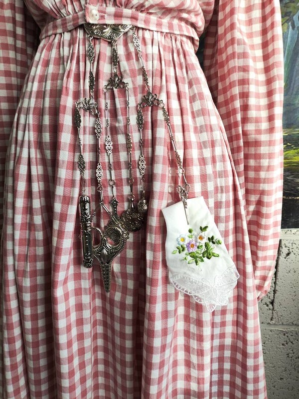 Een chatelaine was in de victoriaanse tijd het prachtstuk van de outfit, en waren ook nog een praktisch. Zo konden er sleutels, gereedschap, parumflesjes, notitieboekjes, pennen, knoophaken en nog veel meer aan gehangen worden. Dé decoratieve gereedschapsriem uit de victoriaanse tijd.